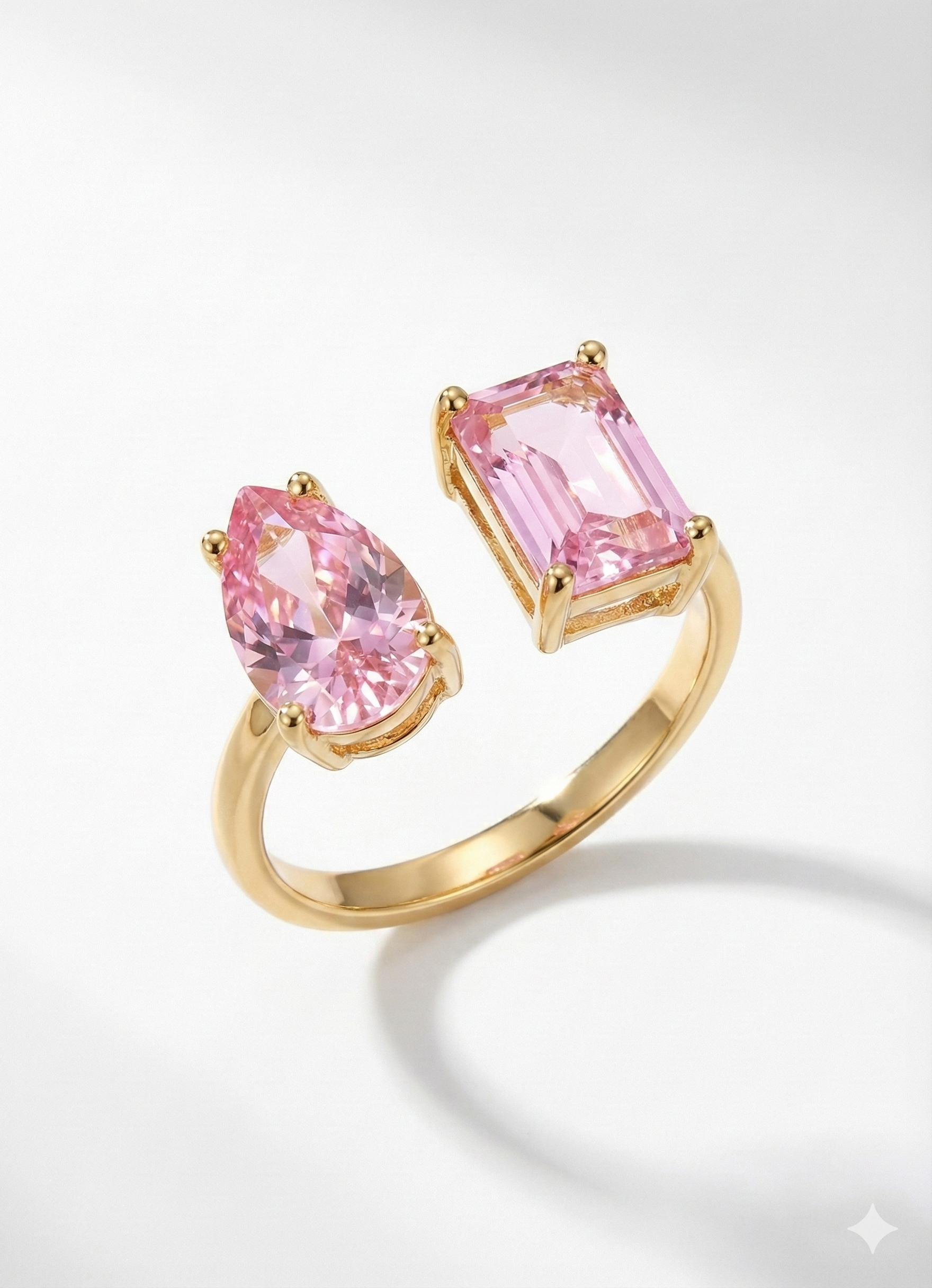 The Toi et Moi Pink Duo Ring features two distinct stones set in perfect balance — a deep emerald-green rectangular cut paired with a luminous pear-shaped clear stone. Minimal yet striking, it’s the kind of ring that feels modern, intentional, and endlessly wearable.